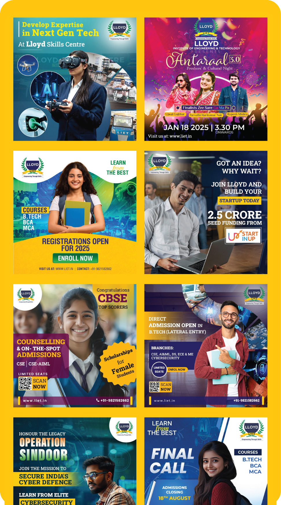 For LIET, we designed engaging event and admission creatives that highlight campus life, achievements, and opportunities for aspiring students.